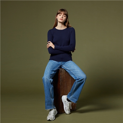女裝 直坑條紋長袖針織衫-深藍