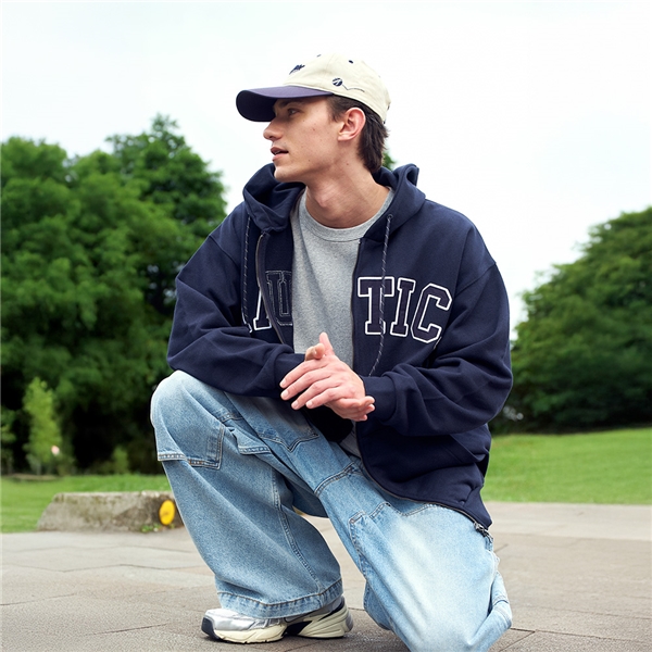 經典弧形LOGO厚磅布繡雙拉鍊連帽外套-藍色