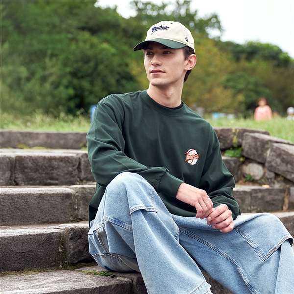 (REEBOK聯名款)美式復古棒球刺繡純棉長袖T恤-綠色