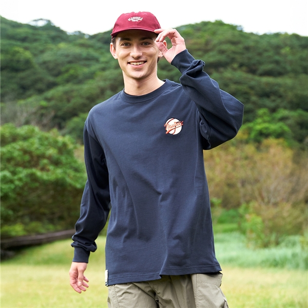 (REEBOK聯名款)美式復古棒球刺繡純棉長袖T恤-藍色