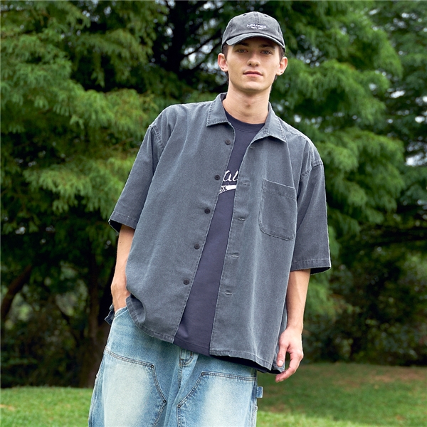 MR.POPBOY條紋雙口袋短袖襯衫-藍色