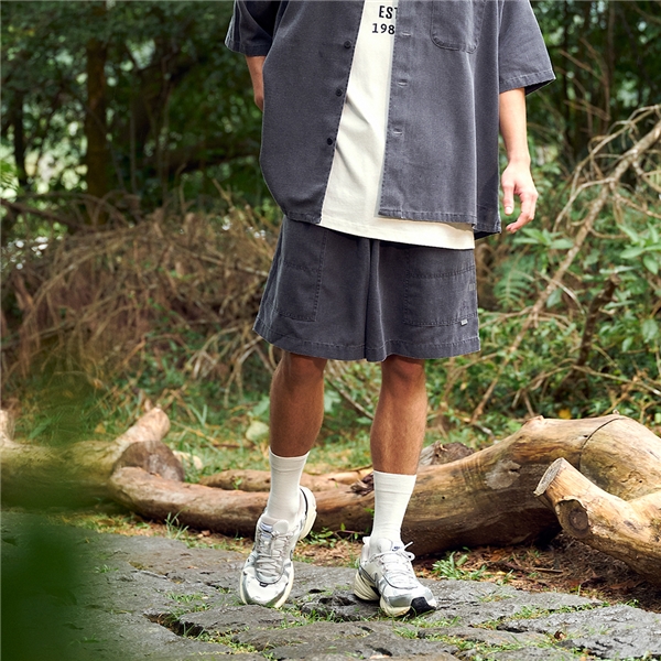 復古超寬版雙膝補丁五分牛仔短褲-藍色