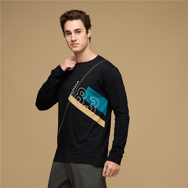 男裝 撞色幾何圖形印花長袖T恤-黑色