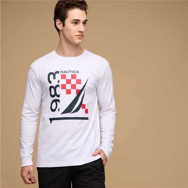 男裝 帆船與賽車旗格紋印花長袖T恤-白色
