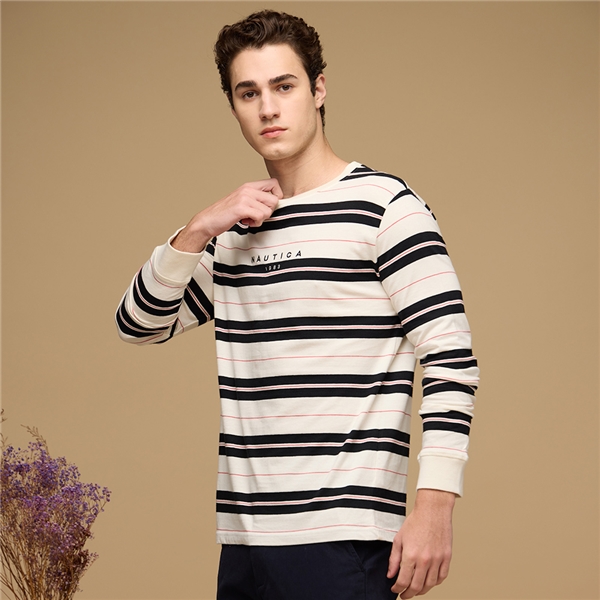 男裝 撞色條紋美式休閒長袖T恤-紅白色