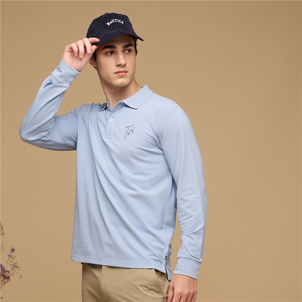 男裝 鯊魚刺繡長袖POLO衫-淺藍色