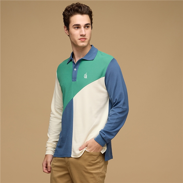男裝 復古色塊拼接POLO衫-藍綠色