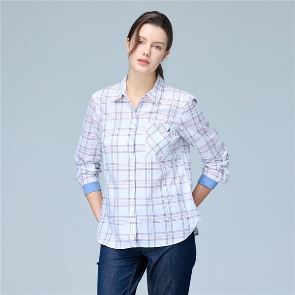 女裝 都會休閒格紋長袖襯衫-白色