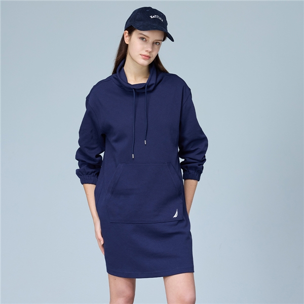 女裝 立領抽繩長袖連身裙-藍色
