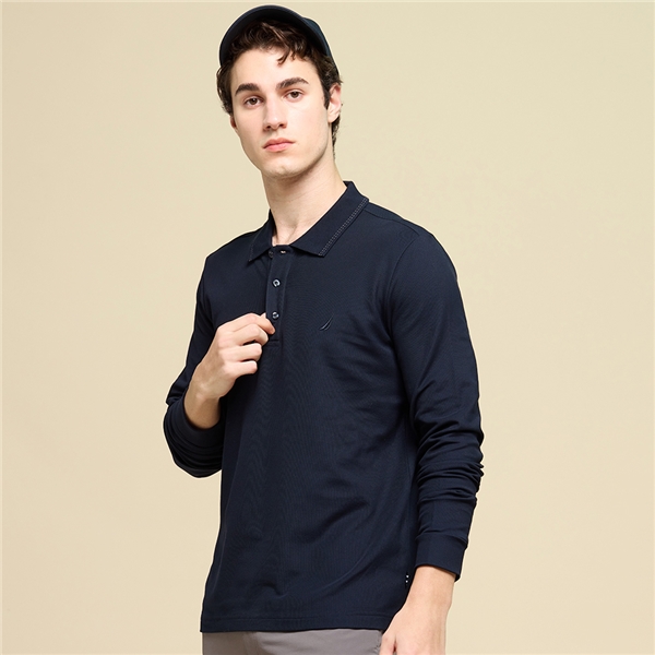 男裝 旗幟織標長袖POLO衫-藍色