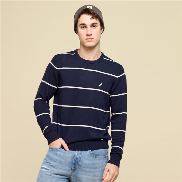男裝 跳色線條圓領線衫-藍色