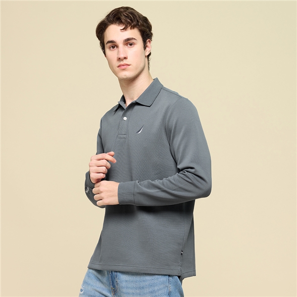 男裝 跳色LOGO素面長袖POLO衫-藍灰色