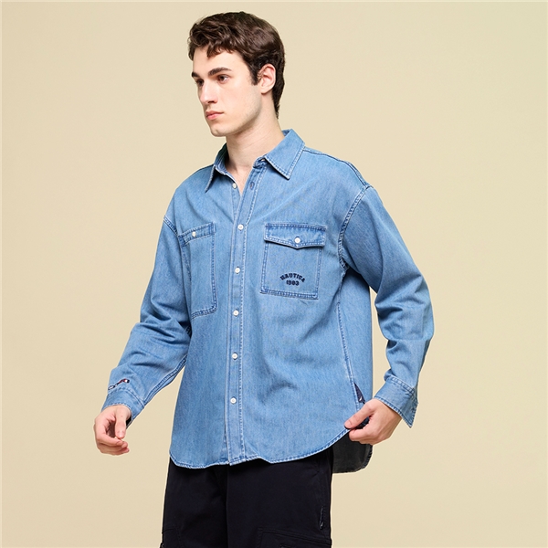 男裝 雙口袋丹寧長袖襯衫-藍色