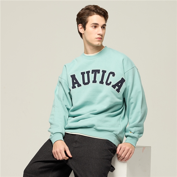 經典弧形LOGO厚磅寬鬆長袖大學T-藍色