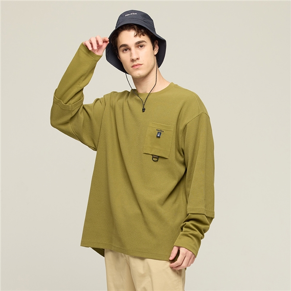 華夫格假兩件機能口袋長袖T恤-深藍色