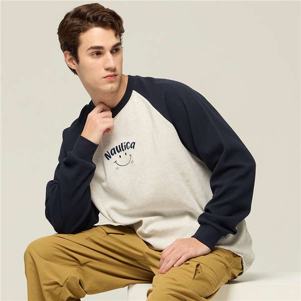 華夫格復古笑臉拼色長袖T恤-深藍色