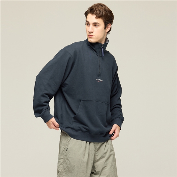 跳色立領半開襟拉鍊POLO衫-深藍色