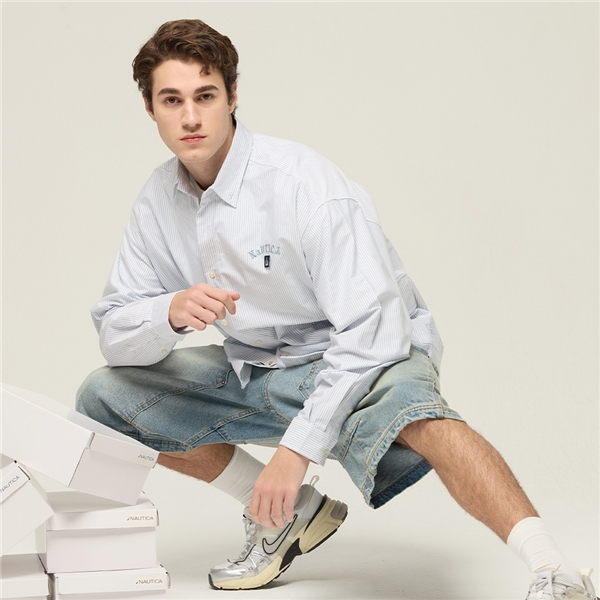 (Reebok聯名款)潮流棒球風圓領長袖襯衫-藍色