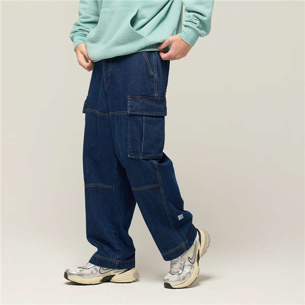 街頭寬版大口袋丹寧長褲-藍色