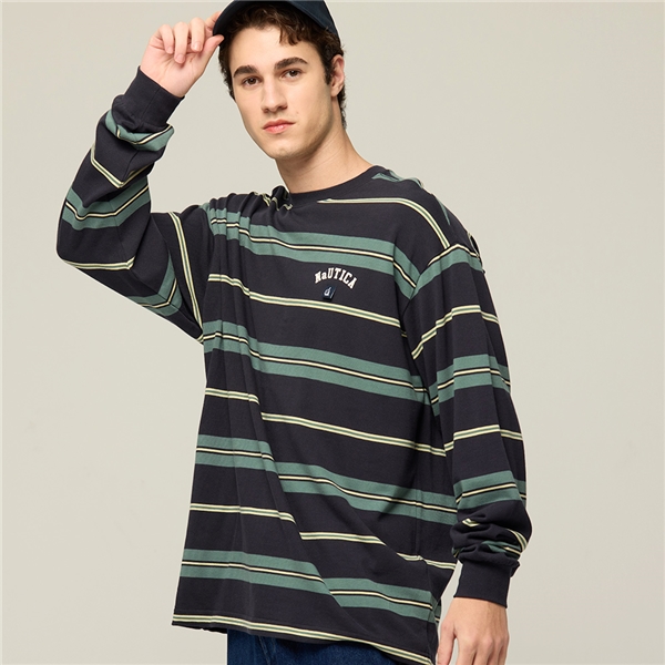 華夫格復古笑臉拼色長袖T恤-深藍色