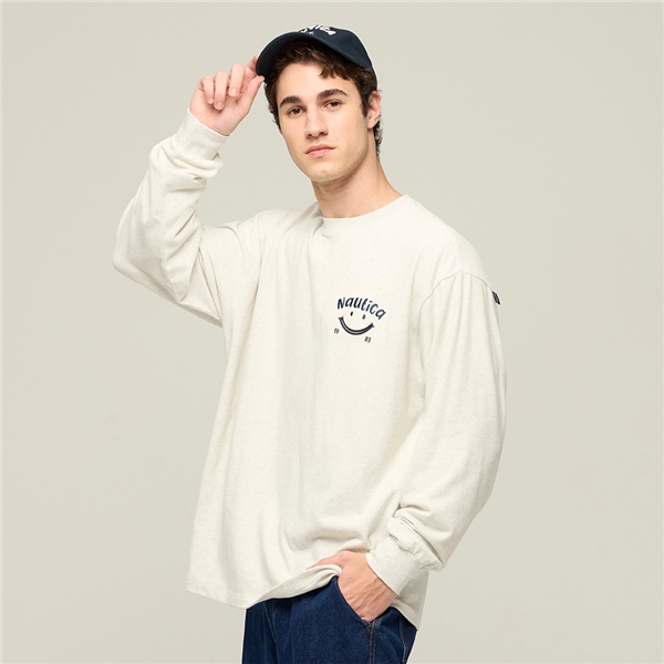 俏皮笑臉刺繡重磅長袖T恤-米白色