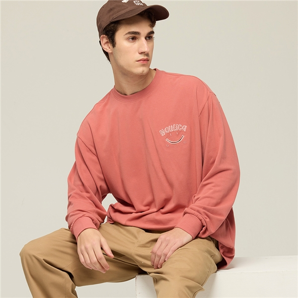 俏皮笑臉刺繡重磅長袖T恤-粉紅色