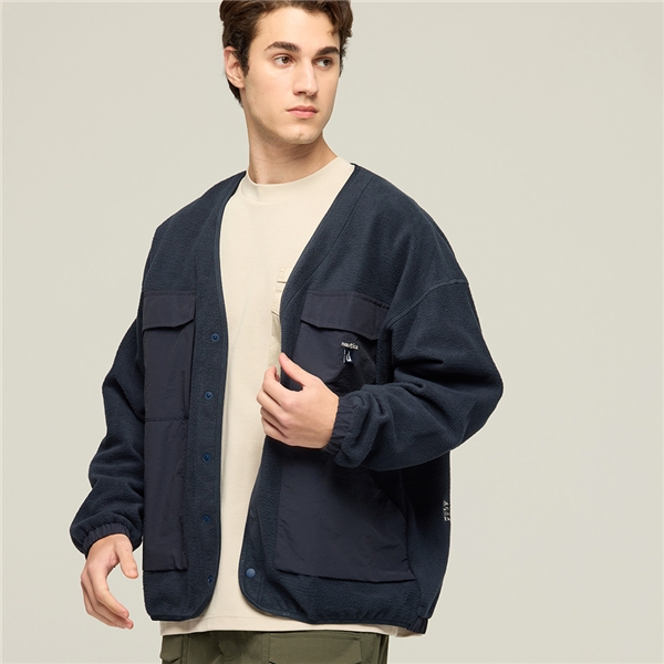 拼接工裝抓絨開襟外套-深藍色