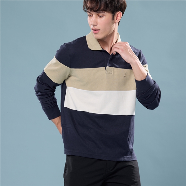 男裝 跳色領口拼接長袖POLO衫-藍色