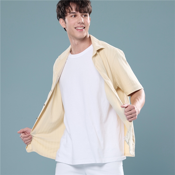 男裝 古巴領短袖條紋襯衫-米色