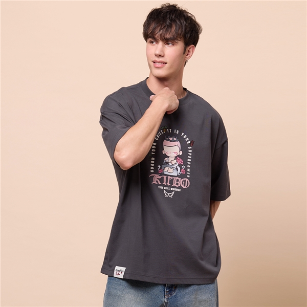 POP MART KUBO 惡魔造型聯名印花純棉短袖T恤-深灰色