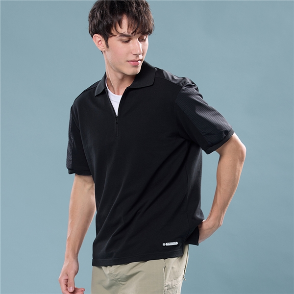 男裝 極簡異材質拼接短袖POLO衫-黑色