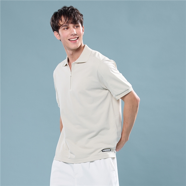 男裝 極簡異材質拼接短袖POLO衫-杏色