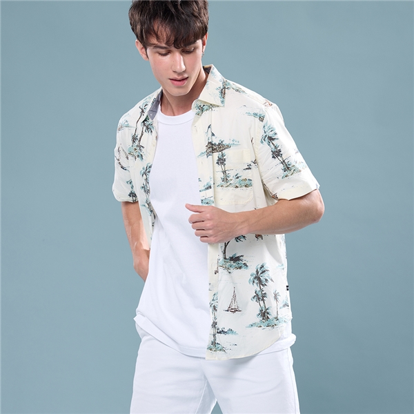 男裝 熱帶海島印花棉質短袖襯衫-米色