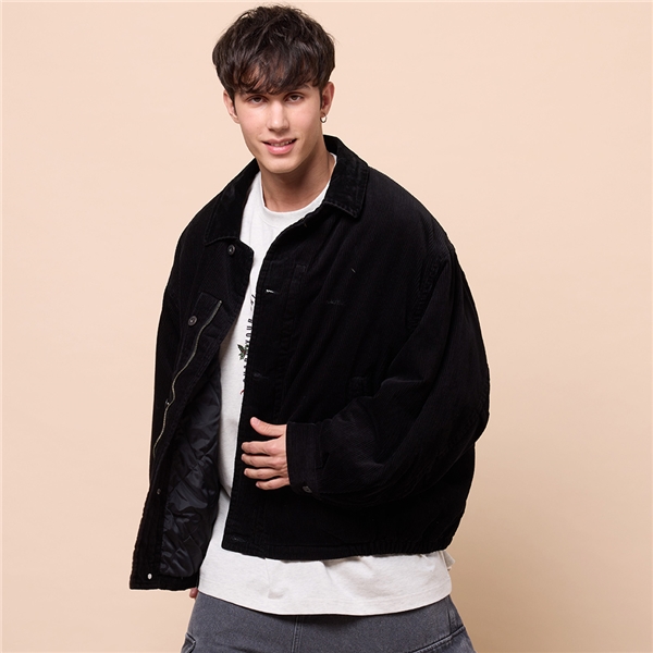 鋪棉異質翻領燈芯絨短版夾克外套-黑色