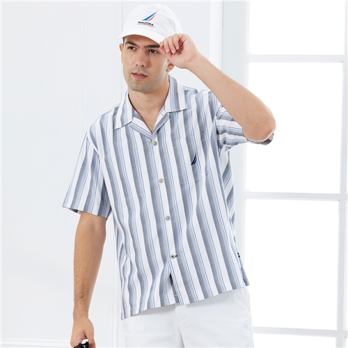 古巴領設計,復刻南美風情 灰藍直條紋,打造夏日清爽氣息 春夏氛圍感穿搭的必備單品 胸前口袋設計,置物更加方便