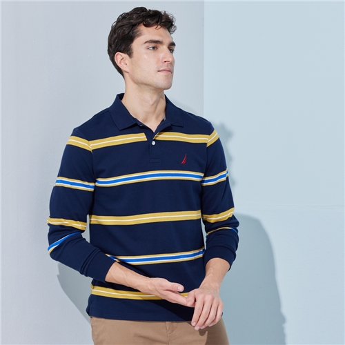 男裝 經典撞色條紋長袖POLO衫-深藍