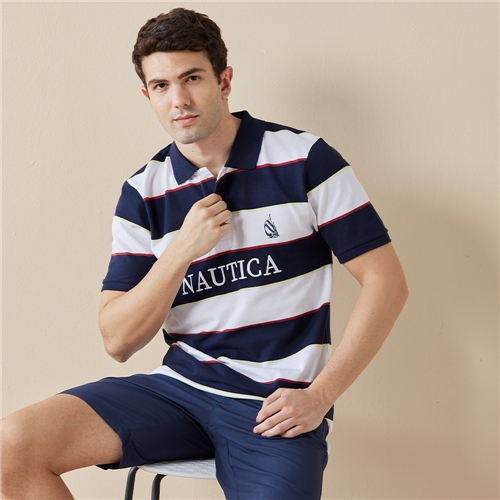 男裝 粗條紋LOGO刺繡短袖POLO衫-深藍色