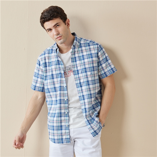 藍白相間格紋設計,休閒百搭 內含天絲棉材質,穿著透氣不易悶熱 環保再生面料製成,友愛地球環境 添加彈性纖維材質,提高活動方便性