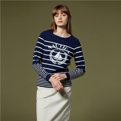橄欖枝帆船印花,展現品牌精神 版型設計簡約俐落,時尚有型 相間條紋展現多元活潑魅力