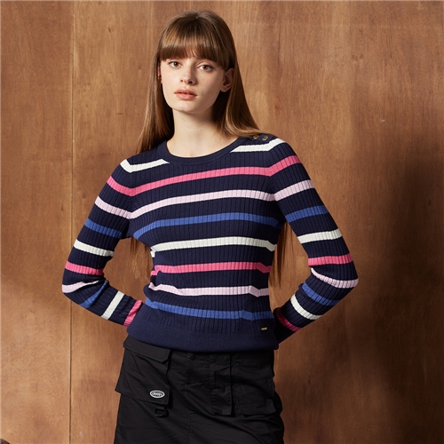 女裝 直坑條紋多彩長袖針織衫-深藍