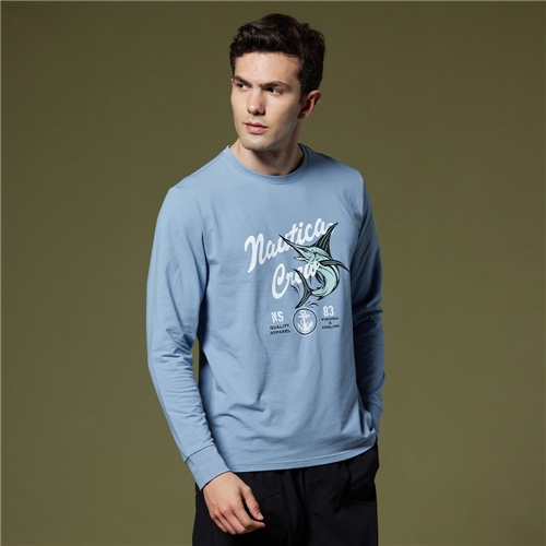 男裝 跳色領圍旗幟印花長袖POLO衫-藍色