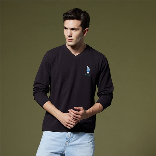 男裝 鯊魚圖騰刺繡V領長袖T恤-黑