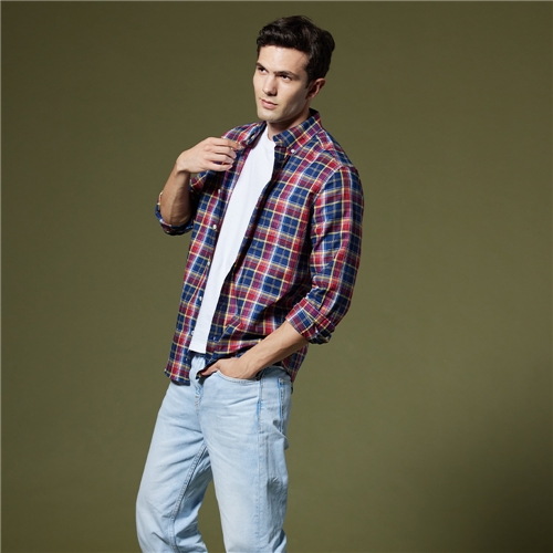 男裝 跳色格紋休閒長袖襯衫-藍紅