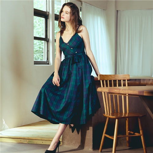 經典格紋穿出氣質的女人味 V領細肩帶設計迷人性感 綁帶腰身設計,修飾下半身形
