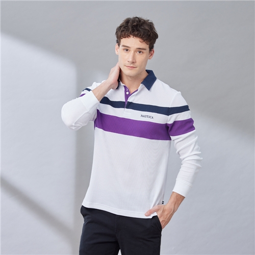 男裝 跳色領圍旗幟印花長袖POLO衫-白色