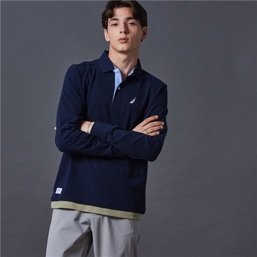 男裝 跳色拼接純棉長袖POLO衫-藍色